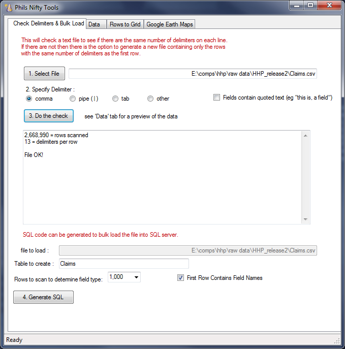 As I needed to frequently check files and automatically generate scripts to load the data, I wrote a tool (niftytools.exe, windows only) that has been a massive time saver. This checks the file, corrects dogy rows or removes them and generates the script to load data into SQL Server.
